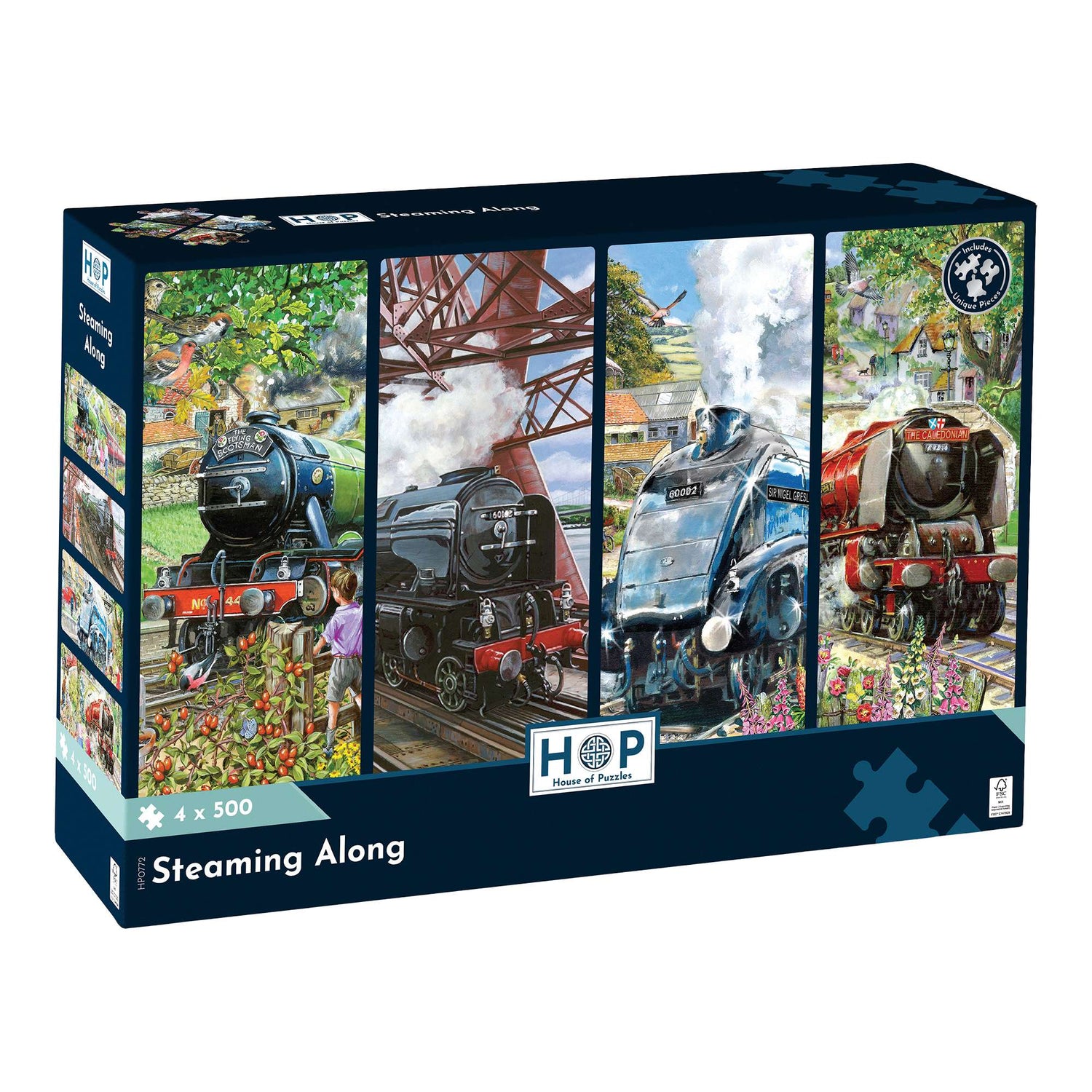 Endless puzzling fun awaits with our fascinating Steaming Along series. This multi puzzle pack includes 4 jigsaws magnificently illustrated by talented artists. These multi pack jigsaw puzzles are from our 500 piece range and are sustainably made from premium quality FSC® Certified board, promising a satisfying and seamless assembly experience. Completed puzzle dimensions: 34 x 48cm.